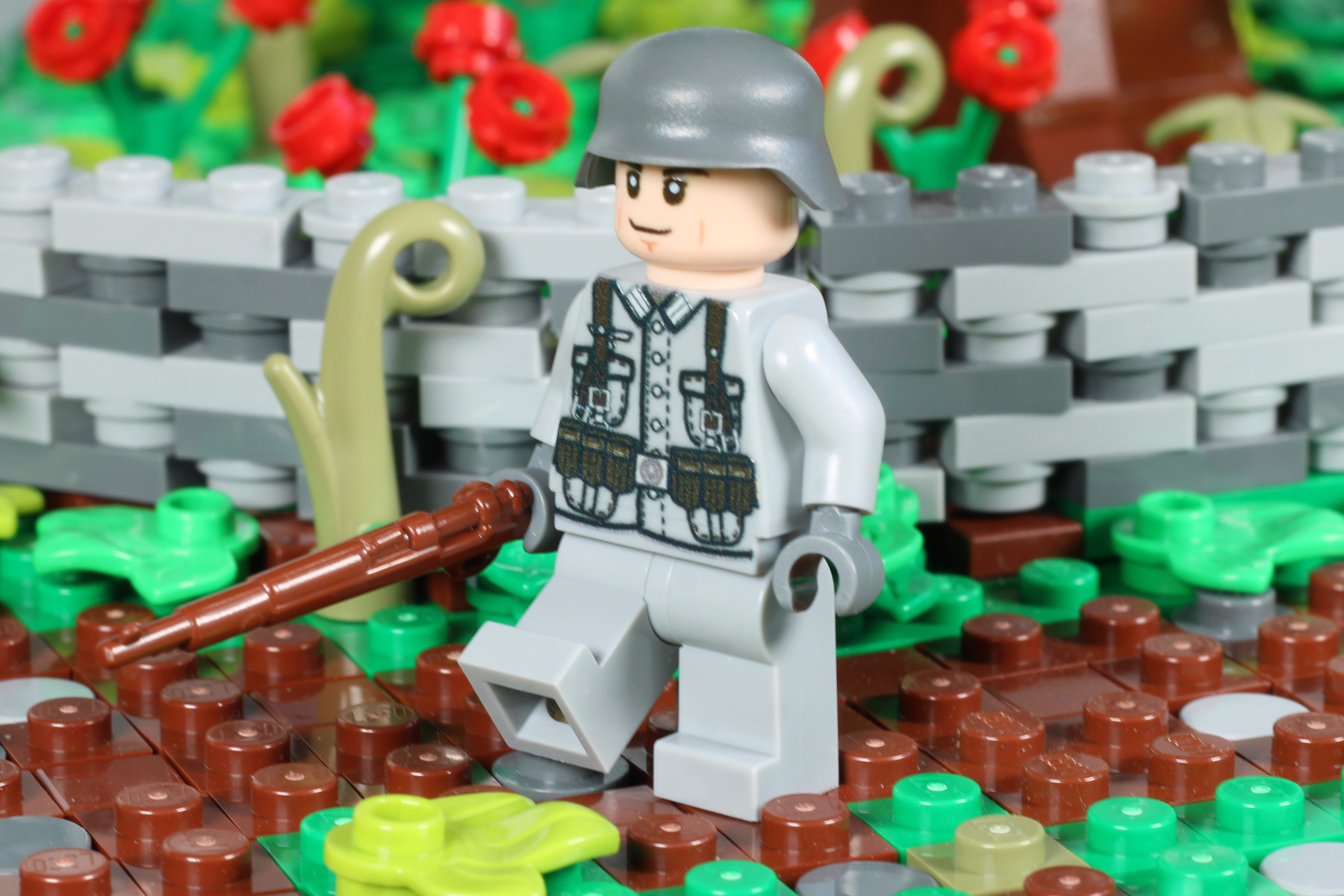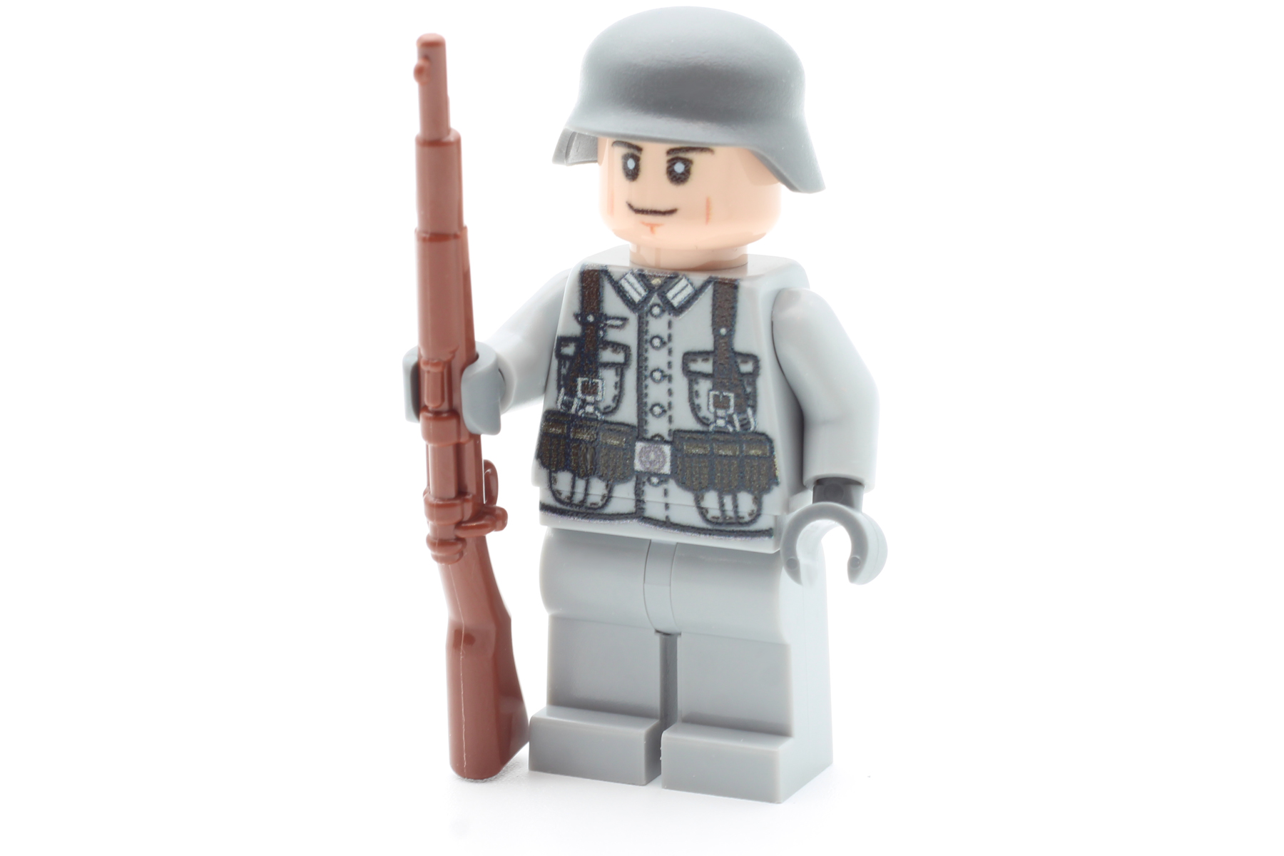 Dieser deutsche Soldat der Wehrmacht ist ausgerüstet mit einem BrickArms Karabiner 98 (K98) und dem berühmten Stahlhelm.